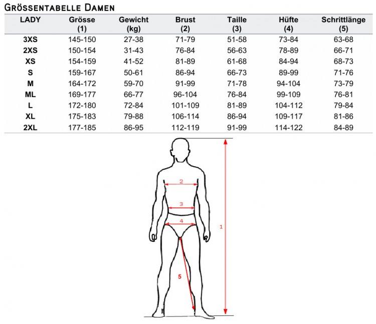 Die W-Größen (wide) sind für Frauen mit durchschnittlicher Körperhöhe und großzügigeren Formen vorgesehen (siehe Größentabelle).